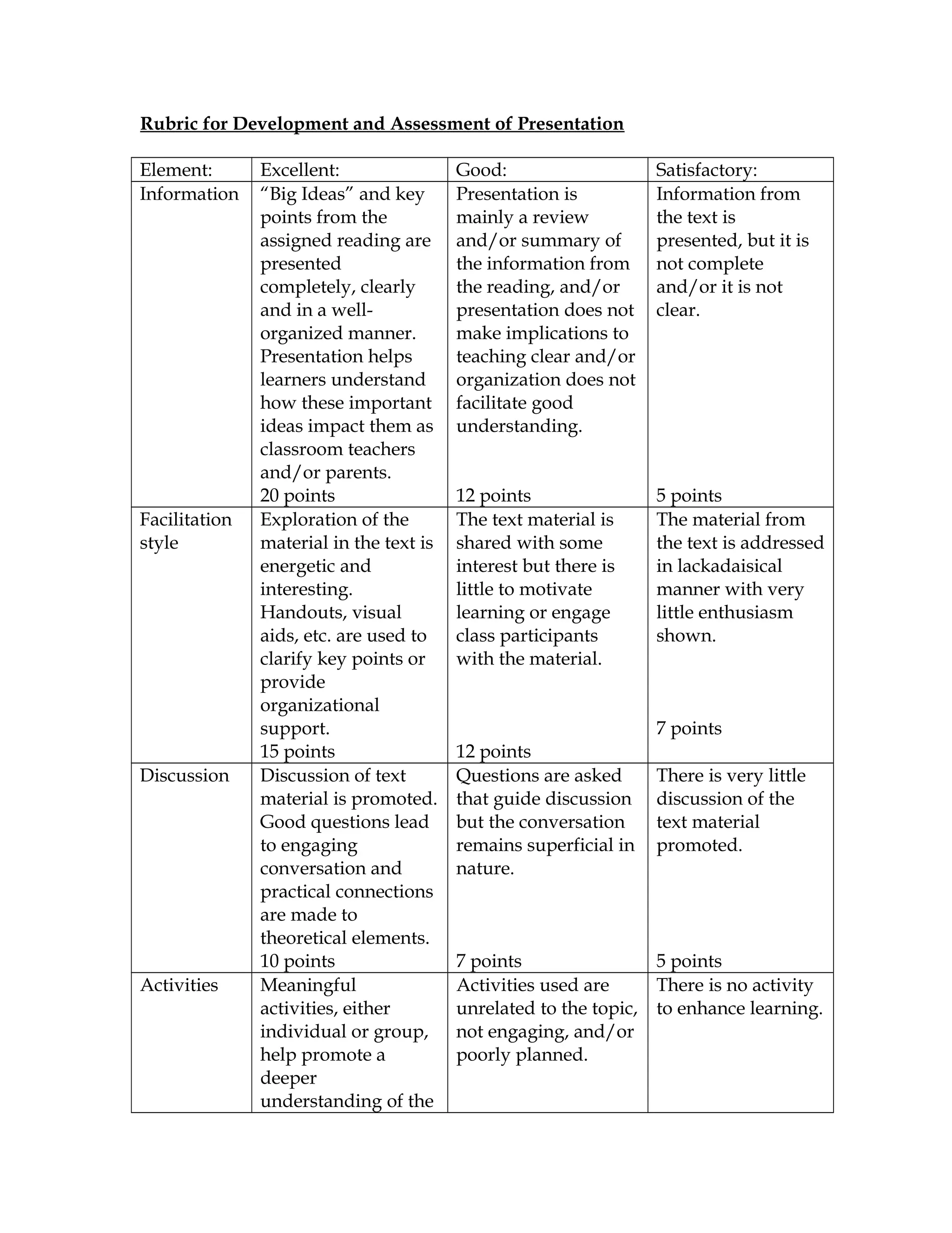 The rubric outlines criteria for assessing presentations on assigned readings in four elements: Information, Facilitation Style, Discussion, and Activities. For each element, criteria are provided for ratings of Excellent, Good, and Satisfactory. For example, an Excellent rating for Information means the big ideas and key points are presented completely and clearly in a well-organized manner, helping learners understand the impact on teaching. A Good rating means the presentation is mainly a review or summary but may not make implications clear or have good organization.
