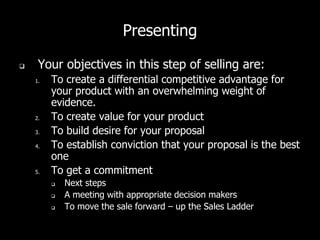 The document provides guidance on how to effectively present to prospects in order to move them up the sales ladder. It outlines objectives for presentations such as creating value, building desire, and establishing conviction. It then discusses structuring calls, dealing with objections, conditions, and discussion tactics. Finally, it offers tips for delivery including establishing eye contact, varying voice, keeping it concise, and tapping into emotions. The overall goal is to create a compelling presentation that differentiates your solution and gets a commitment.