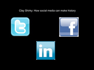 Clay Shirky gave a Ted Talk on how social media can make history. He kept the audience engaged by telling them they were involved, using good visuals like photos from a Chinese earthquake to elicit emotions, and maintaining a highly dynamic presentation with frequent use of color and graphics rather than just text. He emphasized eye contact, engagement of the audience rather than reading from notes, and practice to focus on delivery rather than just content.