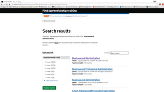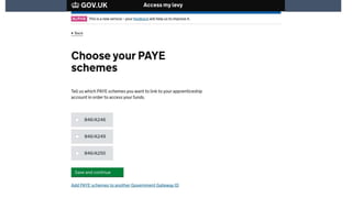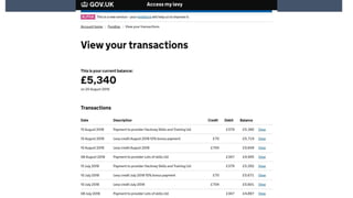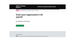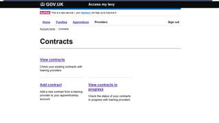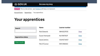 The document discusses preparations for the UK apprenticeship levy, which takes effect on April 6, 2017. It will be charged at a rate of 0.5% of an employer's pay bill and will be paid through the existing PAYE system. Only employers with a pay bill over £15,000 will pay the levy. Funds from the levy can be used to fund apprenticeship training. A new digital apprenticeship service will allow employers to access their funds and purchase training from May 2017. Non-levy paying employers will still receive government co-investment in training costs. The presentation outlines changes to apprenticeship funding and contracting arrangements, and how employers can use the digital service to access funds