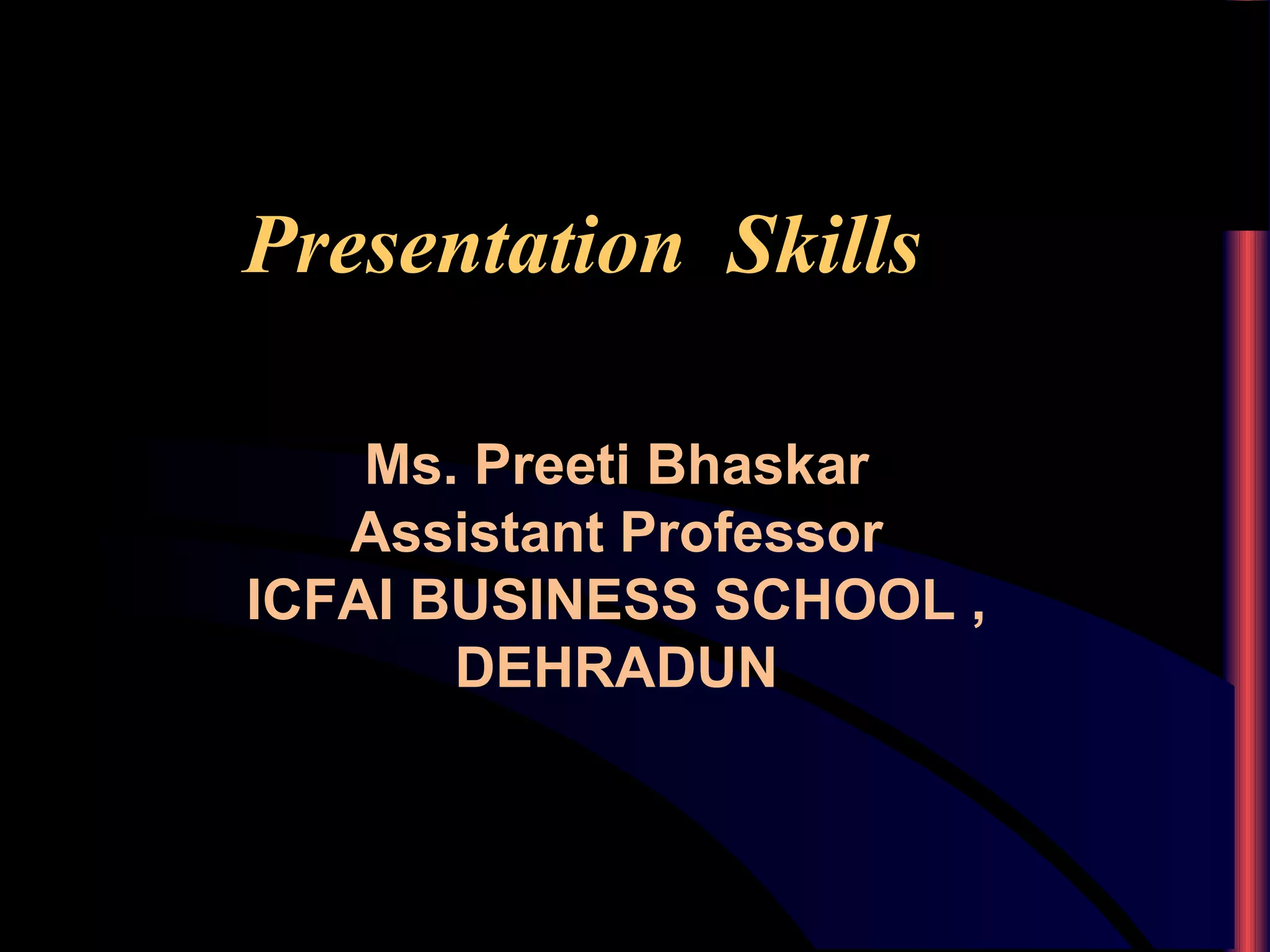 This document provides guidance on developing effective presentation skills. It discusses: