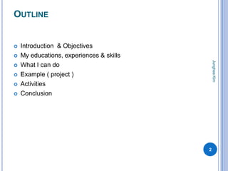 Junghee Kim is applying to SK and outlines her education, experiences, and skills. She has studied petroleum and environmental process engineering at the University of Nottingham and is currently studying petroleum geophysics at Imperial College London. Her experiences include working as a research assistant and assistant manager. Her skills include project management, team leadership, and using various experimental devices and software. She hopes to work as a petroleum geophysicist and uses an example project analyzing a reservoir to demonstrate her abilities.