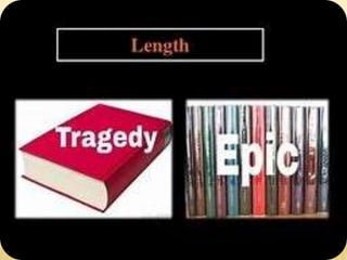 This document summarizes Aristotle's distinction between epic and tragedy. Both epic and tragedy imitate serious subjects and deal with noble characters, but they differ in length, use of the marvelous, and mode of presentation. Tragedy is more concentrated in time and action, while epic allows greater scope and multiple stories. Additionally, tragedy incorporates music and spectacle and presents its story more vividly. Overall, Aristotle considers tragedy superior to epic due to its richer effects and ability to produce catharsis in viewers.