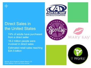 Direct sales in the United States generated $34.5 billion in retail sales in 2014, with 74% of adults purchasing directly from sellers and over 18 million people involved in direct sales. Le-Vel operates with low overhead compared to other companies, allowing for fast response times to solve problems and address issues. The 8 Week Experience from Thrive involves taking capsules in the morning, applying a patch 20-30 minutes later, and using other products throughout the day, with a total daily cost of $5.
