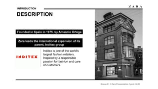 Zara is a clothing brand owned by Spanish fashion company Inditex. It leads the international expansion of Inditex and provides 78% of its total revenues. Zara is known for fashionable and affordable clothing with short lead times and low inventories. In recent years, Zara's revenues have grown 23% and it has increased its international presence through new store openings abroad. Zara's business model relies on rapid design, production, and distribution to keep up with the latest fashion trends at low prices through a vertically integrated supply chain.