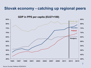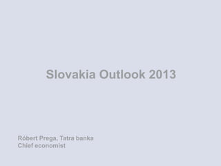 The document discusses the economic outlook for Slovakia in 2013, highlighting a growth projection of 1.5% amid ongoing challenges from the eurozone debt crisis. It emphasizes the importance of government policy and the automotive industry’s declining contribution to GDP growth. The overall economic environment is characterized by high public debt and lower inflation compared to previous years.