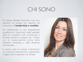 Rossella Giannotti è un'esperta di leadership e vendite con vent'anni di esperienza, avendo ricoperto ruoli commerciali e formativi nelle aziende. La sua filosofia di consulenza si basa sull'importanza delle relazioni umane e sullo sviluppo del capitale umano, offrendo formazione su leadership, tecniche di vendita e team building. I suoi servizi si adattano alle esigenze del cliente e possono essere svolti in vari contesti, anche non convenzionali.