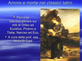 Il documento esplora la rappresentazione dell'amore e della morte nella letteratura latina, evidenziando miti come Orfeo ed Euridice. Si discute la visione romana tradizionale dell'amore come passione destabilizzante e nelle opere di autori come Catullo, Virgilio e Ovidio, mostrando come queste relazioni si traducono in sofferenza e conflitto con le norme sociali. Inoltre, il testo sottolinea l'importanza dei classici latini come fonte di ispirazione per le generazioni future.