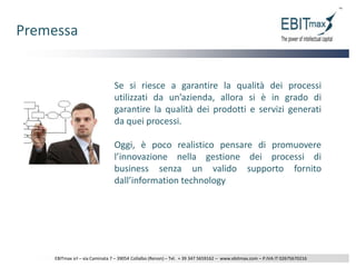 Il documento discute l'importanza del business process modeling (BPM) nella gestione dei processi aziendali, sottolineando la necessità di utilizzare la tecnologia per promuovere l'innovazione e garantire la qualità dei prodotti e servizi. Vengono delineati vari scopi e vantaggi del BPM, inclusi miglioramenti nell'efficienza, nella documentazione e nella compliance normativa. Infine, viene presentato un schema d'intervento in tre fasi per la mappatura e riprogettazione dei processi aziendali.