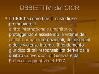 Il Comitato Internazionale della Croce Rossa (CICR) è un'organizzazione umanitaria privata, fondata nel 1863, che promuove il diritto internazionale umanitario e protegge le vittime di conflitti armati. La neutralità è un principio fondamentale che consente al CICR di operare efficacemente, mantenendo riservatezza e evitando giudizi sulle controversie. Nonostante le critiche, la sua storica neutralità ha permesso di accedere a vittime e luoghi di conflitto, portando un importante contributo al diritto umanitario.