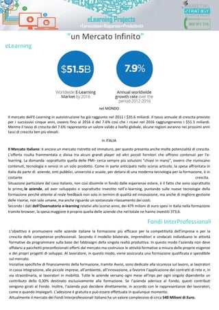 Il documento descrive l'importanza dell'e-learning come strumento di formazione e strategia per le aziende, evidenziando i vantaggi rispetto alla formazione tradizionale in aula. Si analizza il mercato dell'e-learning in Italia e le opportunità di crescita, sottolineando l'interesse delle PMI per soluzioni chiavi in mano e la crescente spesa per tecnologia formativa. Inoltre, viene presentato un modello di franchising che offre formazione e supporto ai franchisee per accrescere la loro competitività e redditività.