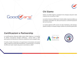 Goodware Systems S.r.l. è una web agency di Napoli che offre servizi di SEO, SEM, social media marketing, e-commerce e web design, con certificazioni ISO che garantiscono standard di qualità elevati. La missione dell'agenzia è supportare i clienti nella creazione e ottimizzazione della loro immagine aziendale e nel raggiungimento di visibilità online. Utilizzando strategie aggiornate e innovative, l'agenzia mira a massimizzare il potenziale commerciale dei progetti web dei propri clienti.