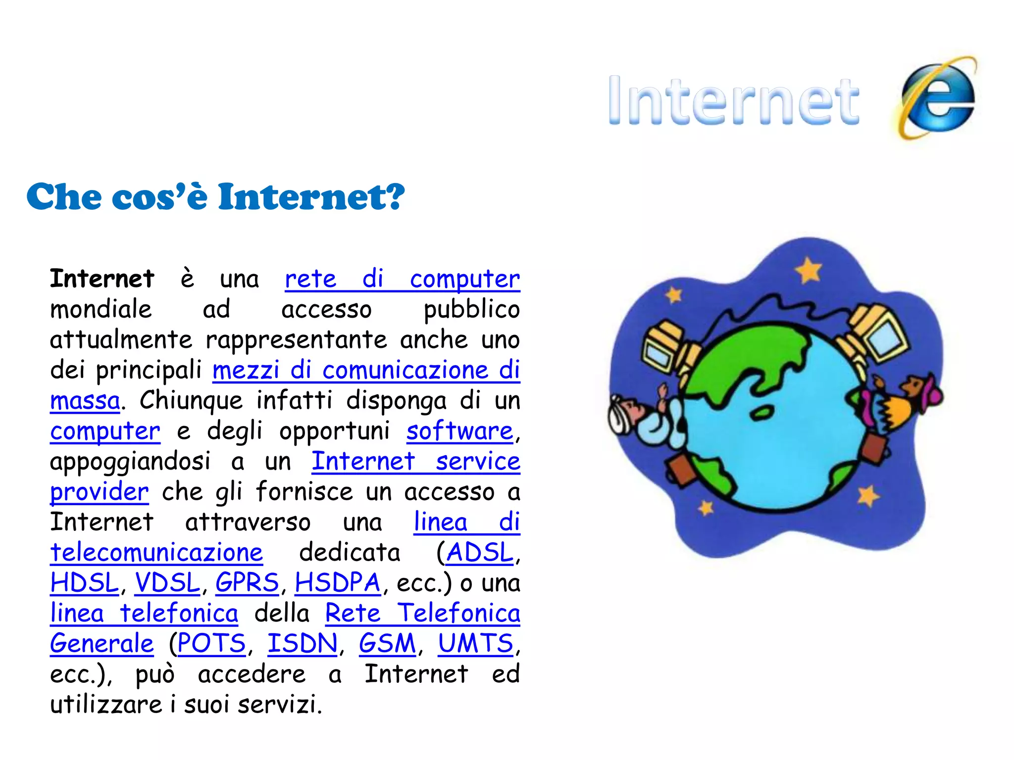 Internet è una rete globale di computer che funge da principale mezzo di comunicazione di massa, accessibile tramite diverse tecnologie. Il World Wide Web, creato nel 1991, ha rivoluzionato la ricerca e la comunicazione online attraverso il protocollo HTTP e l'uso di browser per navigare. I social network, come Facebook e Twitter, permettono agli utenti di creare profili, gestire contatti e costruire comunità basate su interessi condivisi.