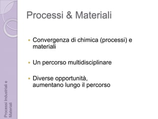 Il documento descrive un corso di laurea in ingegneria dei processi industriali e dei materiali, suddiviso in tre livelli: triennio, biennio magistrale e dottorato, con un focus multidisciplinare su chimica e materiali. Viene evidenziata l'importanza della formazione pratica e delle opportunità lavorative nei settori chimico, energetico e dei materiali, citando anche aziende e istituzioni in cui i laureati possono essere impiegati. Inoltre, il percorso formativo si distingue per l'approccio innovativo e le connessioni internazionali.