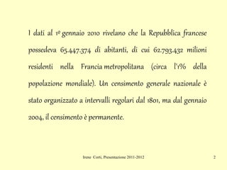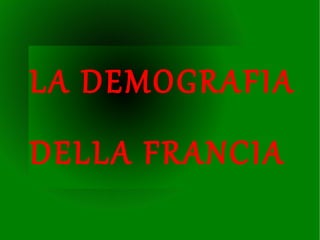 La demografia della Francia al 1° gennaio 2010 mostra una popolazione di 65.447.374 abitanti, con una crescita dello 0,61% annuo grazie a un tasso di natalità superiore alla media europea e un saldo migratorio positivo. La Francia ha un tasso di fecondità di 2,14 bambini per donna, rendendola uno dei paesi più prolifici in Europa. L'immigrazione, che ha avuto inizio nel XIX secolo, è prevalentemente proveniente dall'Europa e dalle ex colonie francesi.
