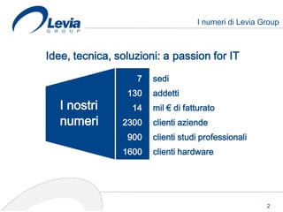 Levia Group è un'azienda con 7 sedi e un fatturato di 14 milioni di euro, che offre soluzioni software gestionali, ERP e applicazioni mobile per PMI e professionisti. Il gruppo è partner di Teamsystem per il nord Italia, proponendo anche soluzioni integrate per la gestione documentale, logistica e comunicazione. Il focus è sulla scalabilità e sull'efficienza dei processi aziendali, migliorando la gestione dei clienti e riducendo i costi.