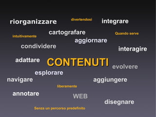 Il documento discute l'importanza della curiosità e dell'improvvisazione nella formazione e nella comunicazione, utilizzando un'analisi critica della presentazione attraverso strumenti come PowerPoint. L'autore, un paleontologo, esplora come le nuove tecnologie e i modelli di e-learning possano liberare la creatività e migliorare l'apprendimento, enfatizzando la necessità di superare preconcetti legati ai tradizionali libri e materiali didattici. Infine, il testo invita a immaginare un futuro dell'ebook e della didattica interattiva, caratterizzato da integrazione e condivisione di contenuti.