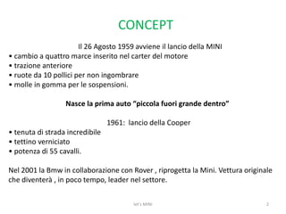 Il documento descrive la storia e l'evoluzione del brand Mini, dal lancio della prima auto nel 1959 fino alla sua riprogettazione nel 2001 da parte di BMW. Viene evidenziato come Mini abbia una forte identità e capacità di attrazione, oltre a dettagli sui diversi target di mercato che spaziano da giovani uomini e donne a famiglie. Infine, si analizzano le strategie di marketing e comunicazione che hanno portato Mini a diventare un leader nel settore automobilistico.