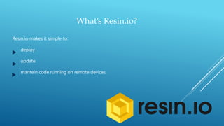 This document summarizes Resin.io, a platform that makes it simple to deploy, update, and maintain code running on remote devices. Resin.io allows developers to push code to their project in the Resin.io cloud, where it compiles for the device architecture. It then deploys the code to connected devices through containerization using Docker. Resin.io provides device management, monitoring and APIs to control deployment of code updates to devices from a remote location.