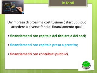 Il documento descrive varie opzioni di finanziamento per startup e piccole imprese, inclusi finanziamenti con capitale proprio, prestiti, crowdfunding e venture capital. Vengono evidenziati anche i ruoli dei business angels e dei venture capitalist nel supportare startup in fase iniziale, con particolare attenzione ai rischi e ai benefici associati a ciascuna fonte di finanziamento. Infine, si discute dell'importanza del microcredito e delle finanziamenti pubblici e europei per lo sviluppo di progetti imprenditoriali.