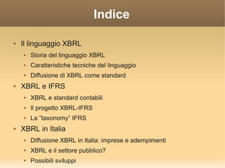Il documento descrive il linguaggio XBRL (Extensible Business Reporting Language) e il suo utilizzo nel financial reporting, evidenziando la sua storia, caratteristiche tecniche e diffusione a livello globale. Esamina anche l'interazione tra XBRL e gli standard IFRS, oltre alla situazione in Italia, dove l'uso di XBRL è diventato obbligatorio per i bilanci dal 2008. Infine, tocca le potenzialità future di XBRL, inclusa la sua applicazione nel settore pubblico e nelle ricerche sui dati finanziari.