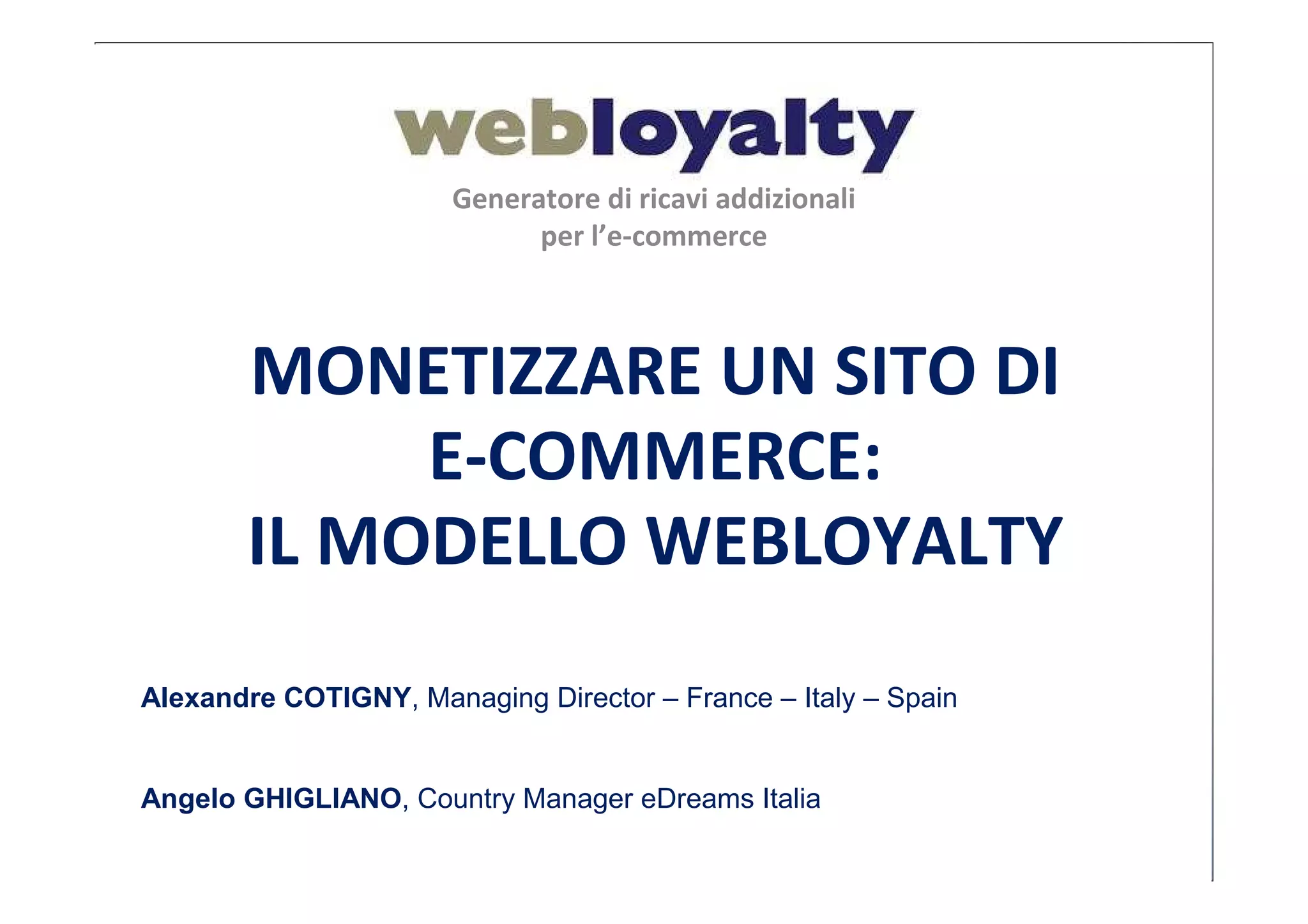 Webloyalty è un modello di monetizzazione per siti di e-commerce, nato nel 1999, che offre servizi post-transazionali per generare ricavi aggiuntivi e stimolare il ri-acquisto. Il sistema prevede un'integrazione non invasiva nelle pagine di conferma acquisto, consentendo agli utenti di accumulare cashback e sconti per acquisti futuri. Questo approccio mira a migliorare la fidelizzazione dei clienti e a liberare risorse per arricchire ulteriormente l'offerta dei servizi degli e-commerce.