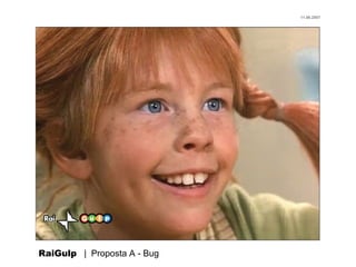Il documento del 11.06.2007 comprende diverse proposte da Raigulp riguardanti vari aspetti qualitativi e grafici, tra cui logo, bug, promozioni e identità. Sono presentate tre proposte distinte (A, B e C) con dettagli su elementi specifici come break pubblicitari e sottopancia. Ogni proposta esplora differenti opzioni per migliorare l'immagine del marchio e la comunicazione visiva.