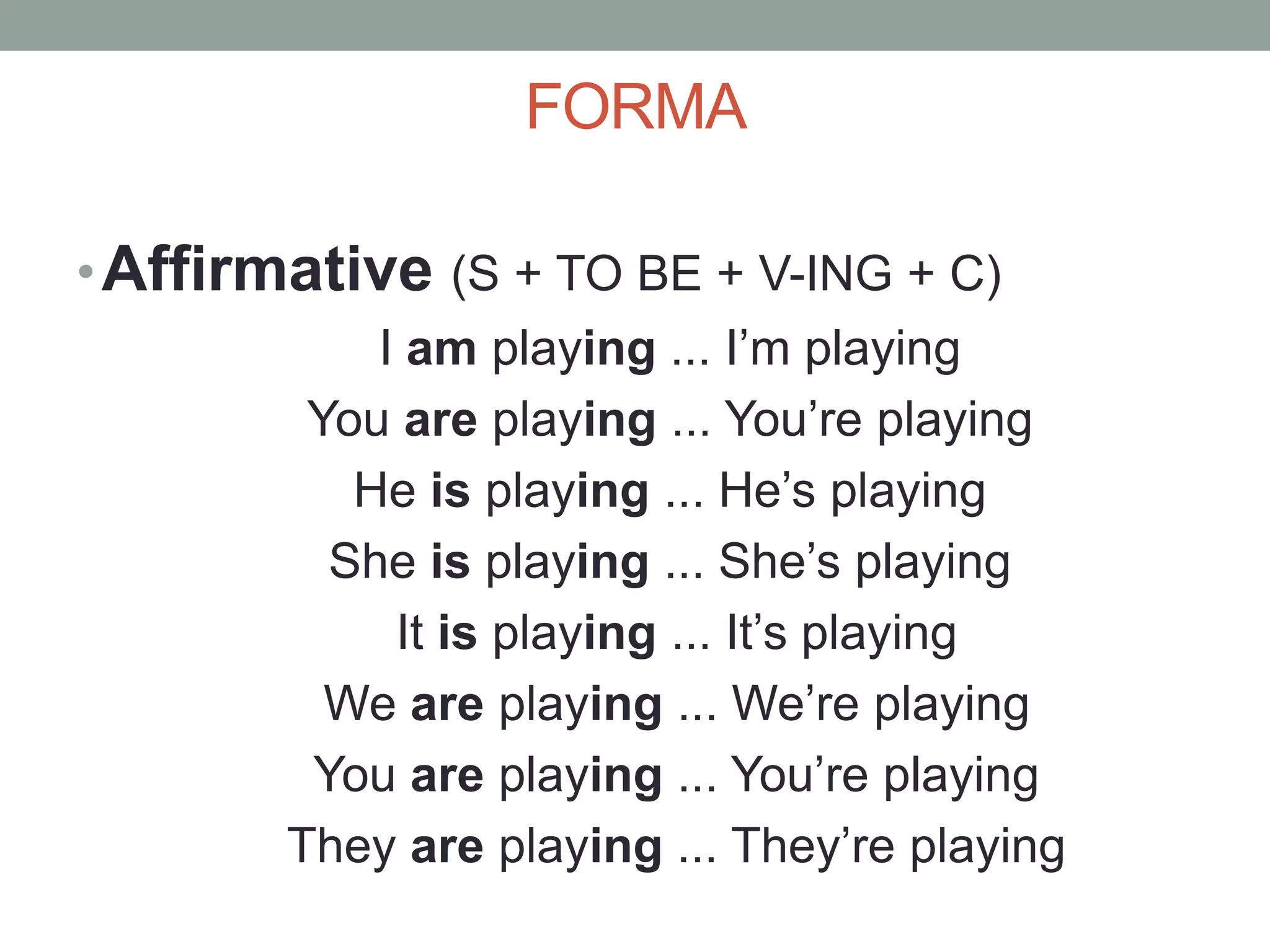 This document provides information about the present continuous tense in Portuguese. It lists the affirmative forms of the present continuous tense for each pronoun. It explains that the present continuous is used to talk about actions that are happening at the moment of speaking and often uses words like "now" or "at the moment". It provides rules for forming the -ing ending in Portuguese verbs and an exception for stative verbs like understand, think, know, like, love, hate and want which are not used in the continuous tense.
