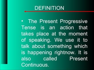 The present progressive tense is used to describe actions that are occurring at the moment of speaking. It utilizes the present form of the verb "to be" along with the present participle form of the main verb. Examples are given of affirmative, negative, and interrogative sentence structures in the present progressive. The tense can be used to describe both short-term actions happening now and future events that have been planned.
