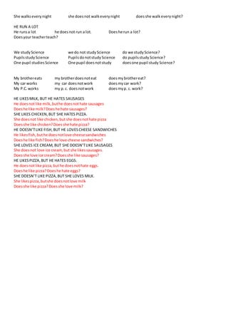 The document describes the simple present tense in English. It explains how to form affirmative, negative, and interrogative sentences using the simple present. Examples are provided of using the simple present with common verbs like eat, walk, study, play, and go. Likes and dislikes are also expressed using the simple present tense.
