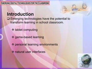 This document discusses emerging technologies that have the potential to transform learning, including mobile apps, tablet computing, game-based learning, personal learning environments, and natural user interfaces. It describes how these technologies engage students and better meet the needs of different learners. While technologies can be useful tools, quality instruction is still important. The document outlines several advantages of integrating technology, such as improved performance and productivity, but also notes disadvantages like potential loss of focus or not all students having access.