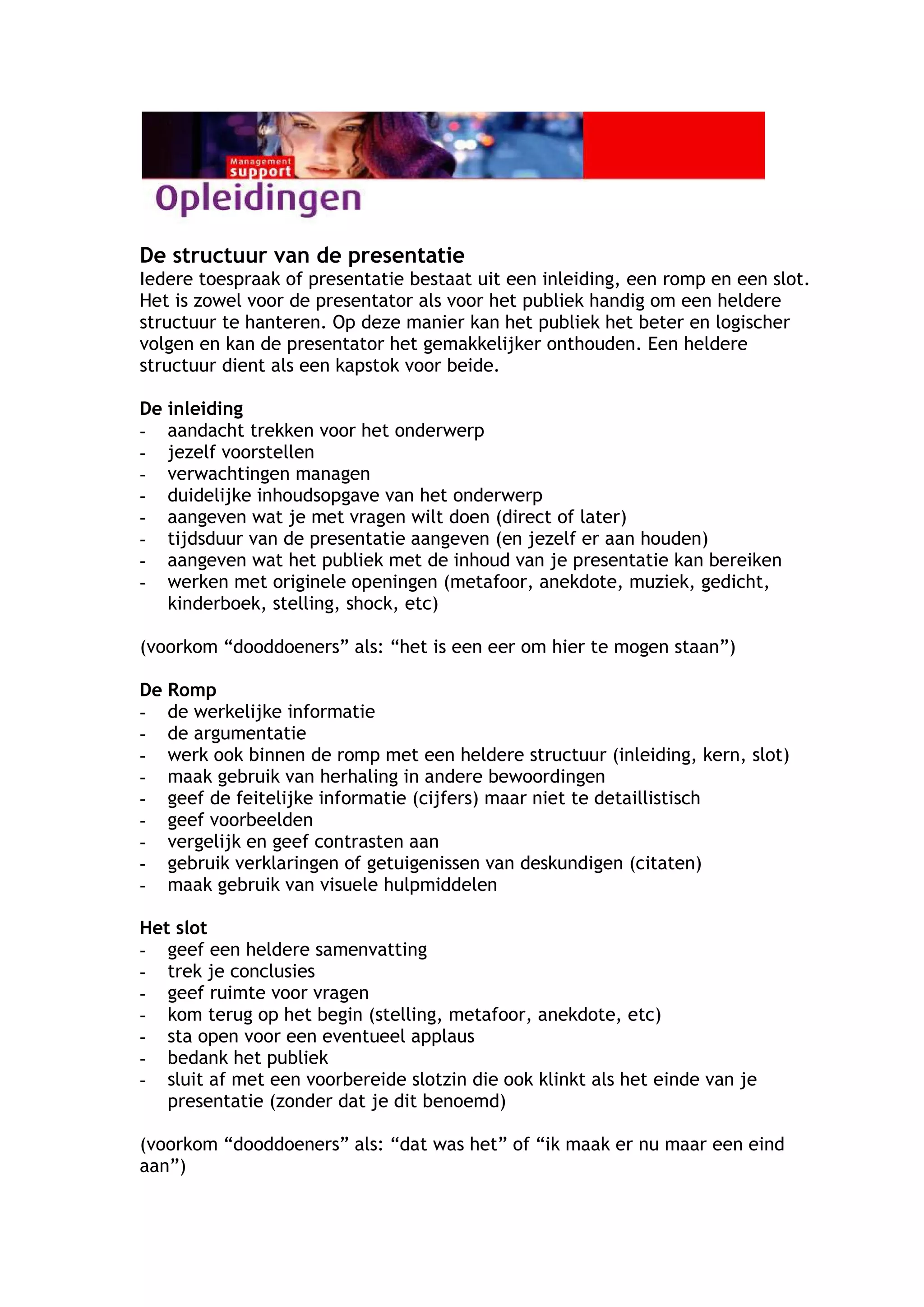 Iedere toespraak of presentatie bestaat uit een inleiding, een romp en een slot.