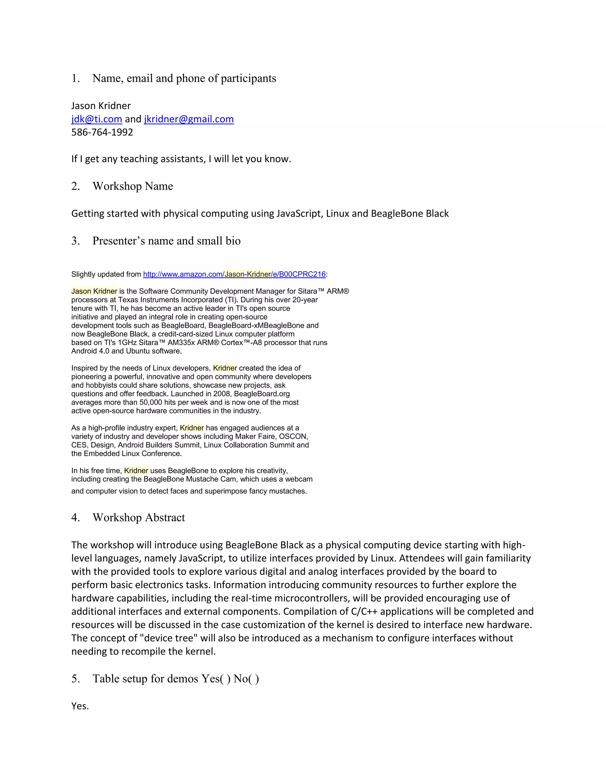 1. Name, email and phone of participants: Jason Kridner, jdk@ti.com and jkridner@gmail.com, 586-764-1992. If teaching assistants are provided, their names will be shared.