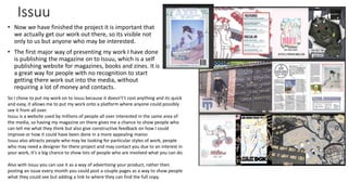 The document discusses different ways to present a project magazine to the public, including publishing it on Issuu, a self-publishing website. Issuu allows anyone to publish magazines for free and reach a wide audience. Social media is also discussed as an efficient way to showcase work to many people through platforms like Instagram and build an online portfolio. Small, independent skate and BMX shops are presented as another option to get printed copies of the magazine in front of the target audience and local examples are provided. Finally, attending a local zine festival is proposed to get feedback from other designers and industry professionals and make useful contacts.