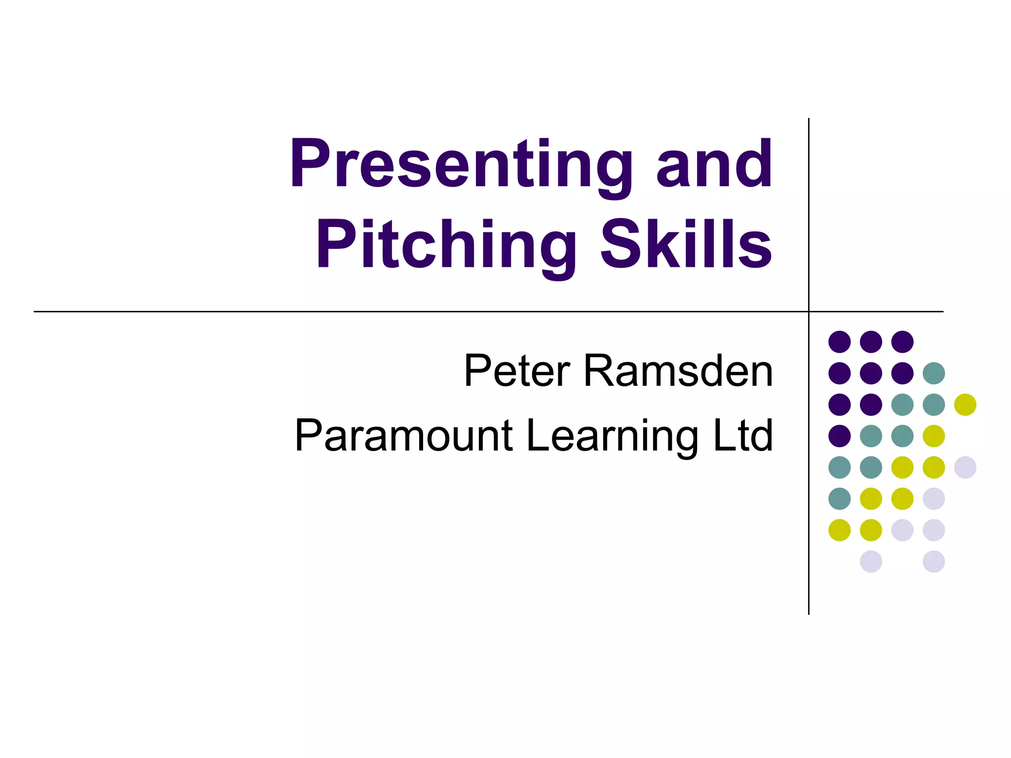The document outlines essential skills for effective presenting and pitching, focusing on preparation, audience analysis, and delivery techniques. Key elements include understanding audience dynamics, structuring content, and practicing for impact while avoiding common pitfalls. It emphasizes the importance of confidence, clarity, and engagement in securing business through effective presentations.