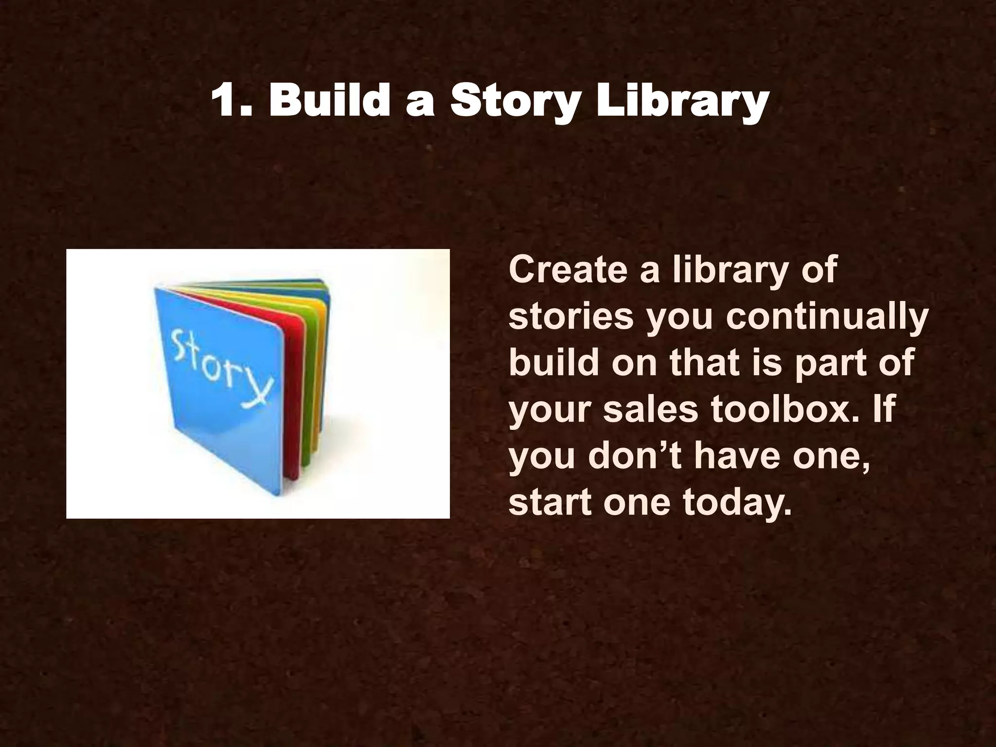 This document provides tips for effectively telling stories in sales presentations. It recommends building a library of stories organized by theme, practicing storytelling skills, getting clients to share their own stories first to understand their needs, and finding natural ways to introduce relevant stories into the conversation using story starters. Mastering the skill of storytelling can help elevate sales presentations and increase sales.