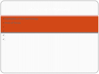 Katherine is presenting a new technology that focuses on specific areas. It has several special features and advantages over similar technologies. The presentation provides information on developing, executing and testing the technology through a demo video and screenshots. In conclusion, the key advantages and features are restated.