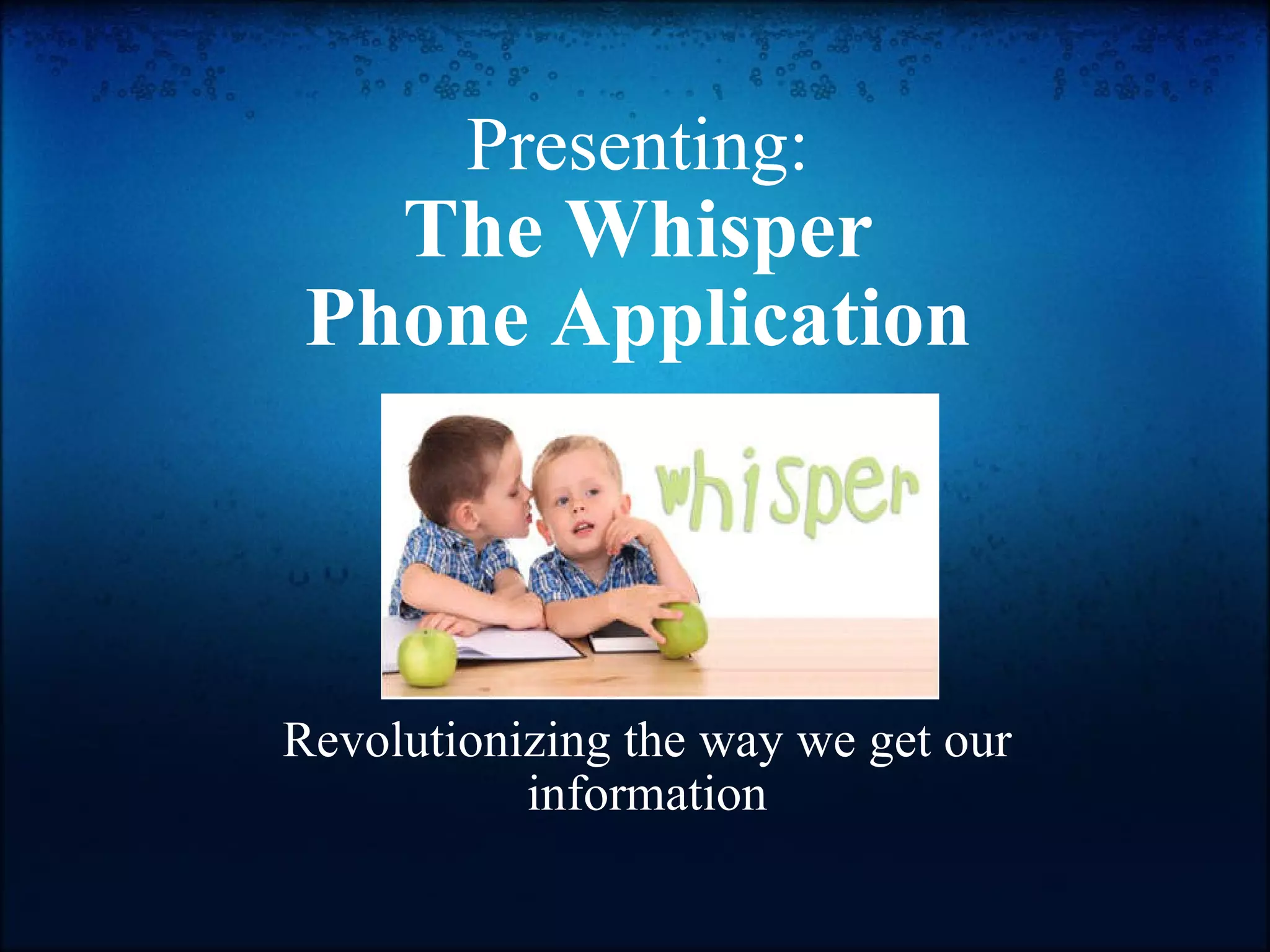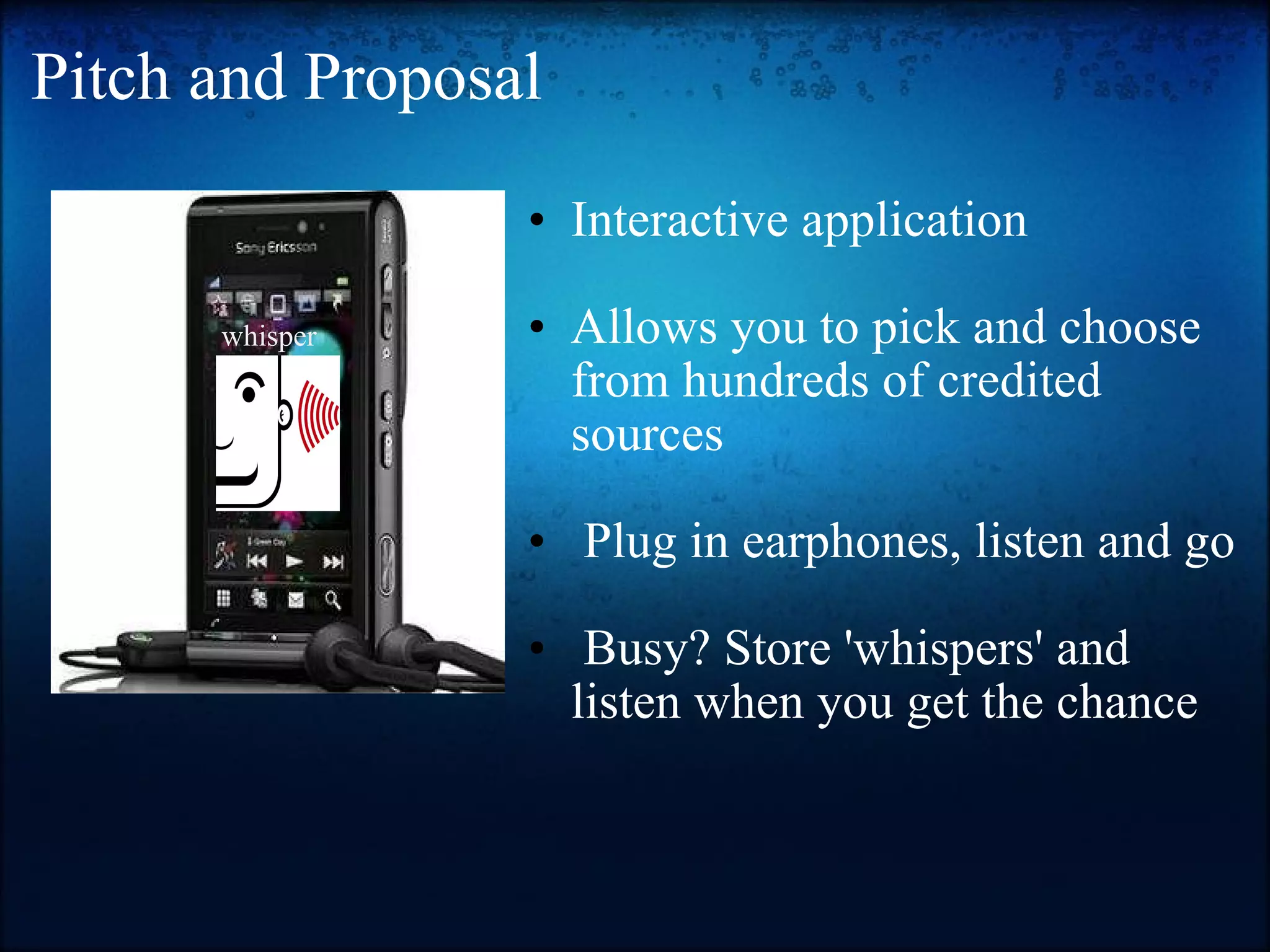 The document proposes a new mobile application called Whisper Phone that allows users to select from hundreds of news sources and have articles whispered to them through headphones. The app aims to address issues with information overload and short attention spans by allowing users to listen to personalized news on the go or save articles for later. Market research suggests the target demographics are people aged 20-40 who have some college education and make over $20,000 annually. The business plan outlines the app's vision, economic assessment, marketing strategy, and expansion goals.