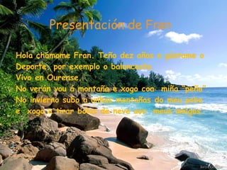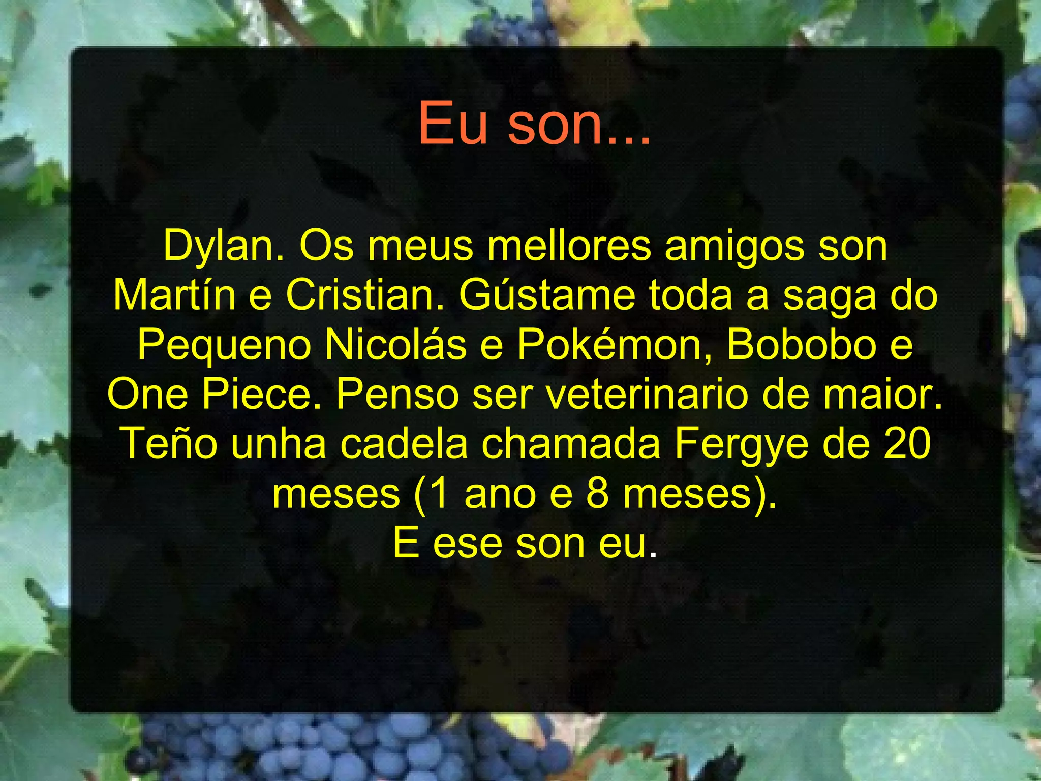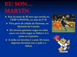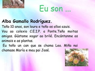 Teño 10 años,o pelo negro, largo e os ollos marróns. Son alegre e divertida e moi amiga das miñas amigas. Gústame quedar coas miñas amigas e facer cousas xuntas. Gustaríame ser veterinaria e profesora de equitación porque me gustan moito os cabalos e os animais. Erea