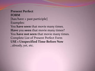 The document discusses the present perfect and present perfect continuous tenses in English. It provides examples of how to use each tense to talk about experiences, changes over time, accomplishments, uncompleted actions, and multiple past actions. It explains that the present perfect is used for unspecified times and the present perfect continuous focuses on duration or process up until now. Key differences are that non-progressive verbs can't be used in the continuous form, and the simple form focuses more on products or quantities while the continuous form emphasizes duration.