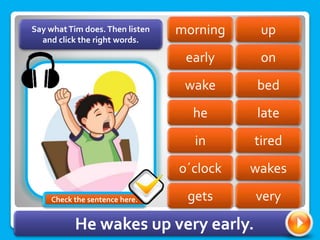The document provides listening practice exercises by describing daily routines and activities of various people. Students are asked to listen to phrases being read and select the correct words to complete sentences about what each person does. The routines described include waking up, washing, eating breakfast, brushing teeth, getting dressed, going to school, having lessons, eating lunch, doing homework, playing, cleaning, eating dinner, watching TV, taking a bath and going to bed.