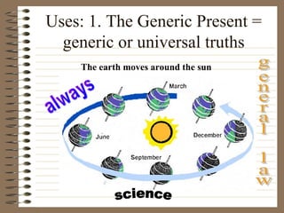 This document provides information about the present simple tense in English. It discusses five main uses of the present simple: 1) for generic or habitual truths, 2) for habitual actions, 3) for instantaneous present actions simultaneous with speaking, 4) with state verbs like "be" and "have", and 5) for planned future actions as part of a fixed schedule. Examples are given for each use, including common adverbials that indicate habitualness or futurity. Verbs of thinking, feelings, and involuntary perception are also discussed. The document concludes with examples of if clauses and time clauses used with the present simple tense.