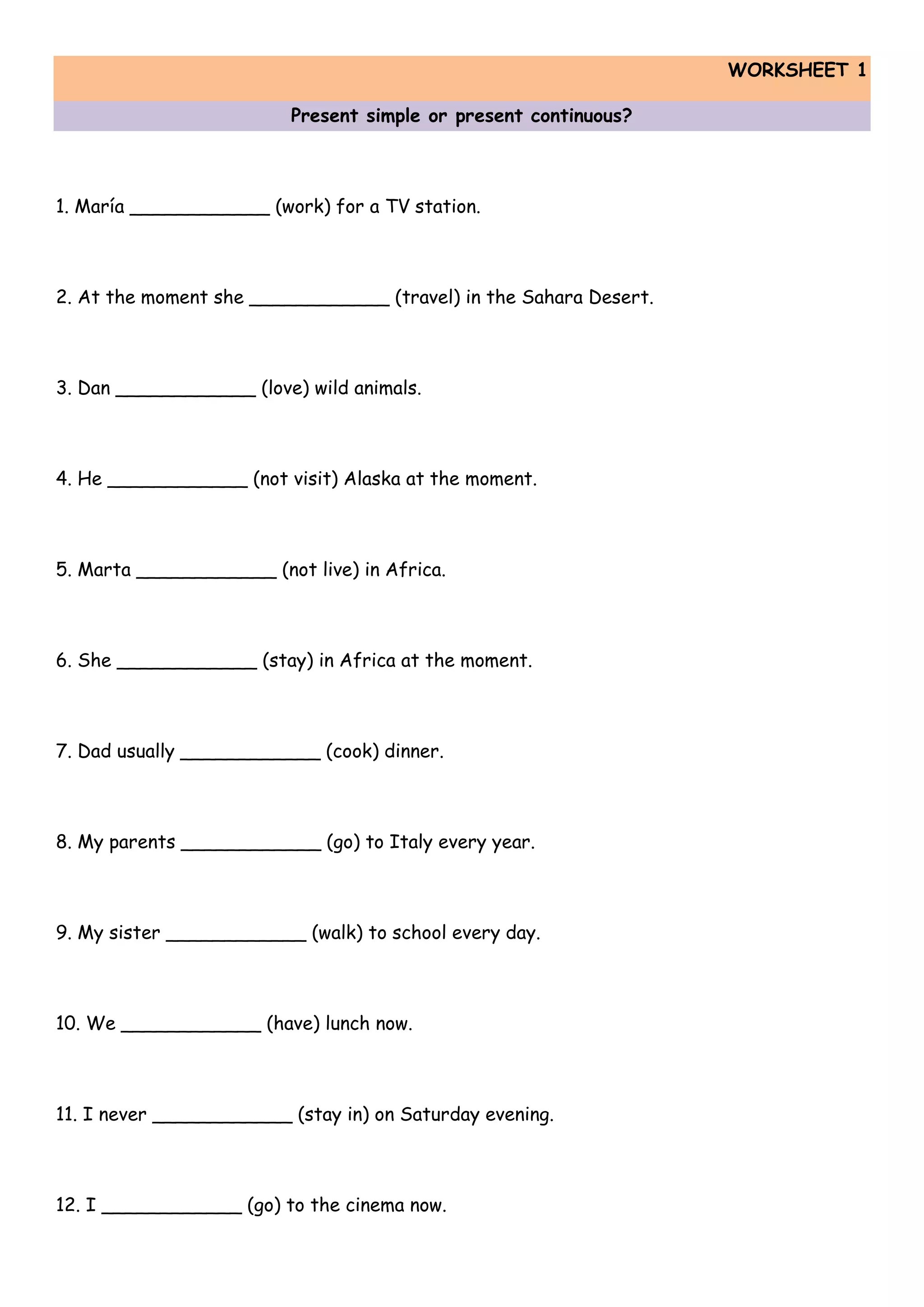 The document contains 4 worksheets that provide examples of sentences using the present simple tense and present continuous tense. The sentences are written in a blank that must be filled in with either the present simple verb form or present continuous verb form. Below each worksheet is a key with the correct answers filled in. The worksheets provide examples of when to use each tense covering common scenarios like habits, repeated actions, ongoing actions happening now, and descriptive statements.