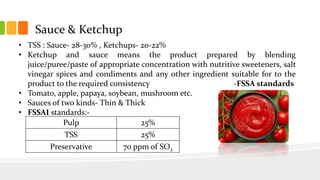 This document provides information on preserving foods using salt, including how to make sauces, ketchups, chutneys, and pickles. It discusses the key ingredients and processes for each. Sauces and ketchups require tomato, apple or other pulp at 25% and a total soluble solids content of 25%. Chutneys require 50% pulp. Pickles are preserved using a brine of 8-10% salt solution which inhibits spoilage organisms. All preserved foods require addition of preservatives like sulfur dioxide or benzoic acid. Proper preparation techniques and avoiding over-ripe produce are emphasized to ensure quality.