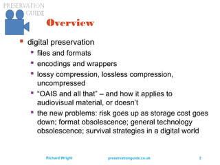 This document discusses preserving audiovisual content in digital files. It covers topics like digital preservation, file formats, encodings, compression methods, and challenges like format obsolescence. The document recommends strategies like using uncompressed formats for audio and saving video in its native format. It also discusses tools that can help with tasks like format identification, validation and metadata extraction to support preservation of large amounts of audiovisual content.