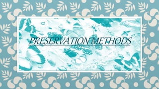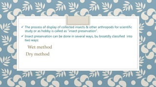 Insect preservation can be done through wet or dry methods. The wet method uses fluid preservatives like ethanol or isopropyl alcohol to stabilize and prevent decay of specimens. The dry method preserves insects without liquid by first killing them using chloroform or benzene, then carding, pinning, or spreading small, medium, and large specimens respectively to be displayed. Proper collection and killing techniques are required before preservation.