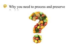 The document provides an overview of food processing and preservation methods aimed at minimizing microbial growth to extend food shelf life and safety. It discusses key techniques like canning, salting, drying, fermentation, and freezing, along with the principles behind microbial control and food enzyme inactivation. Safe practices, especially regarding the handling of specific bacteria such as clostridium botulinum, are emphasized to prevent foodborne illnesses.