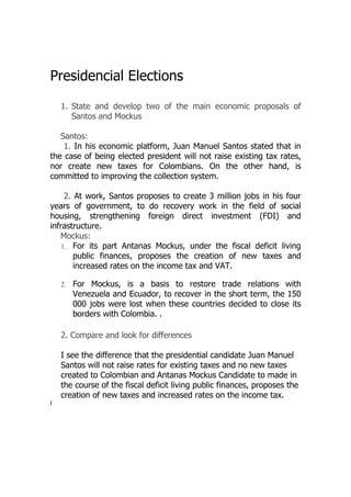 Santos and Mockus have differing economic platforms in Colombia's presidential election. [1] Santos proposes not raising taxes or creating new ones, improving tax collection, and creating 3 million jobs. Mockus proposes new taxes and higher income and VAT rates to address fiscal deficits. [2] Their social proposals also differ: Santos aims to double social housing construction and ensure free education, while Mockus promotes social housing land policy and structural health system reforms through dialogue.