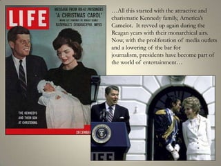 The document discusses how presidents have increasingly become pop culture icons and celebrities due to proliferation of media and a lowering of journalistic standards. This has blurred the lines between their political and entertainment roles, making it difficult for presidents to straddle both worlds. The document also discusses the public's interest in presidents' personal lives and sexuality throughout history, from Kennedy to the Founding Fathers, and how academics approach discussing these topics.