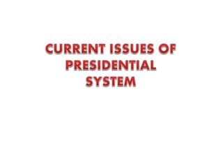 The document provides an overview of the presidential system of government. It defines key characteristics, including that the executive branch is separate from the legislature, the president is both head of state and head of government, and is directly elected. It outlines criteria for a presidential system and notes advantages like direct mandate and speed, but also disadvantages like potential gridlock and difficulty removing an unsuitable president. Examples of countries that use the presidential system are provided, and Turkey's consideration of adopting it is discussed.